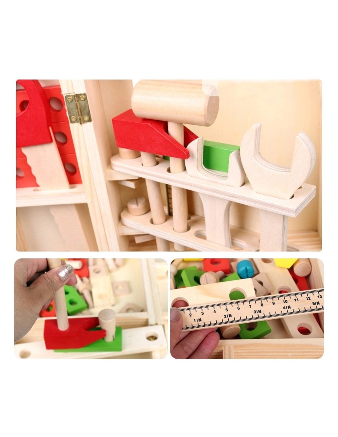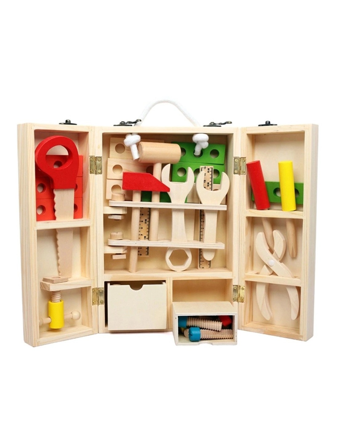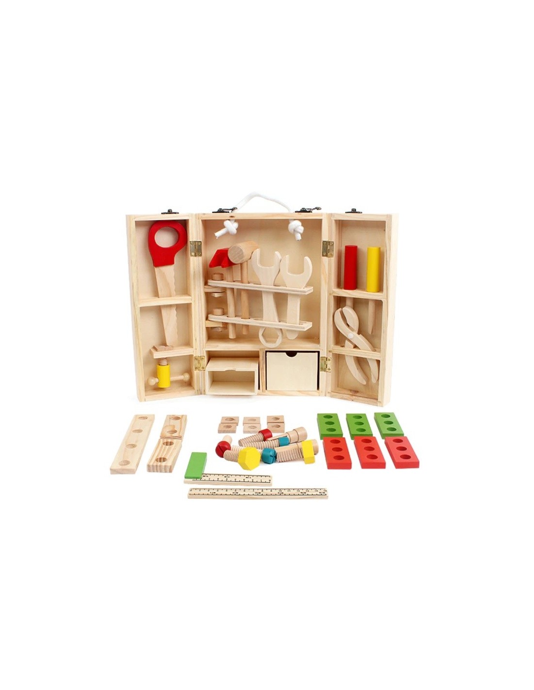 Caja de herramientas de madera para niños, ideal para el juego simbólico y la construcción. Incluye herramientas y piezas para armar y desarmar, estimulando la motricidad fina, la coordinación mano-ojo y la creatividad. Fácil de guardar y transportar, juguete educativo sin pantallas recomendado desde los 3 años.