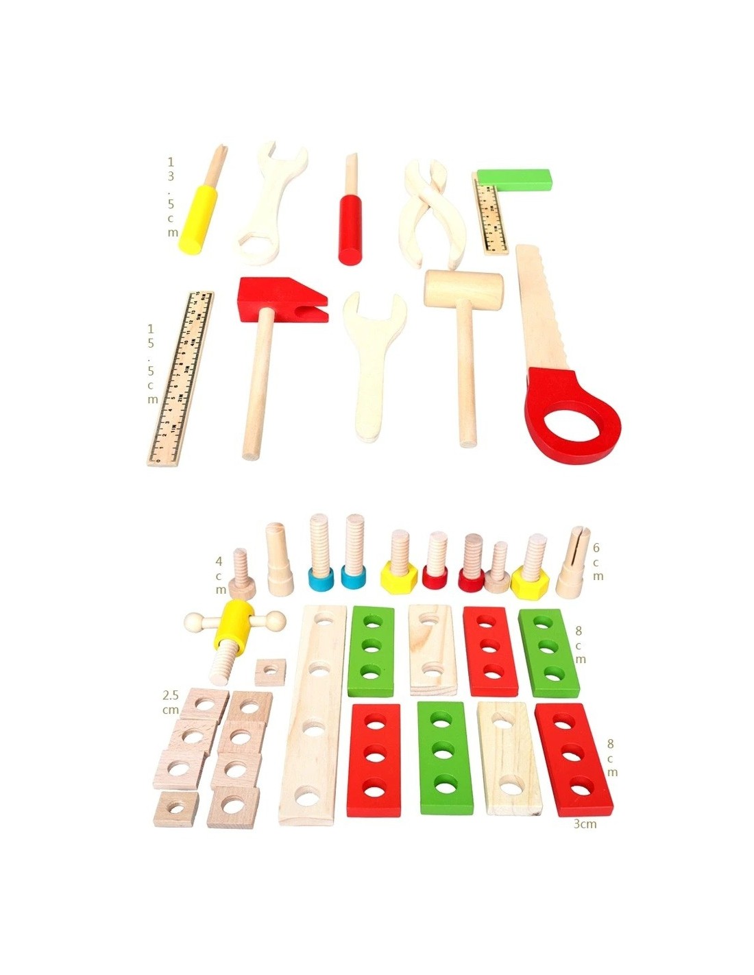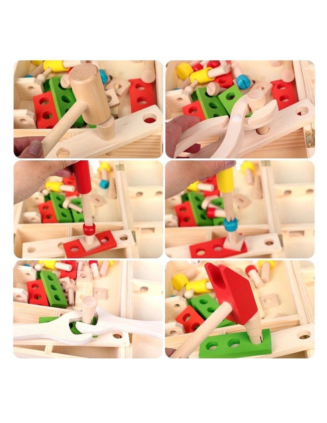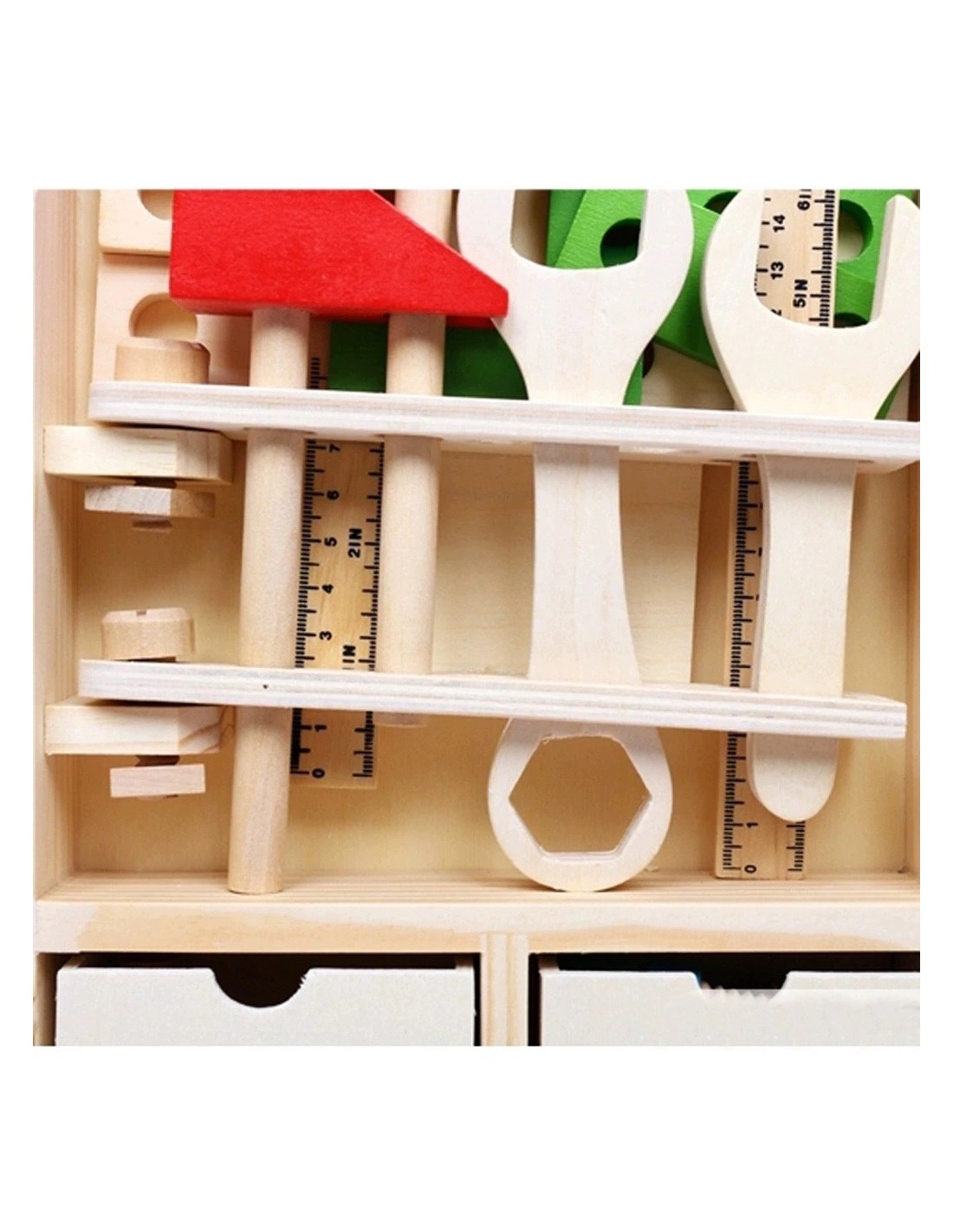 Caja de herramientas de madera para niños, ideal para el juego simbólico y la construcción. Incluye herramientas y piezas para armar y desarmar, estimulando la motricidad fina, la coordinación mano-ojo y la creatividad. Fácil de guardar y transportar, juguete educativo sin pantallas recomendado desde los 3 años.