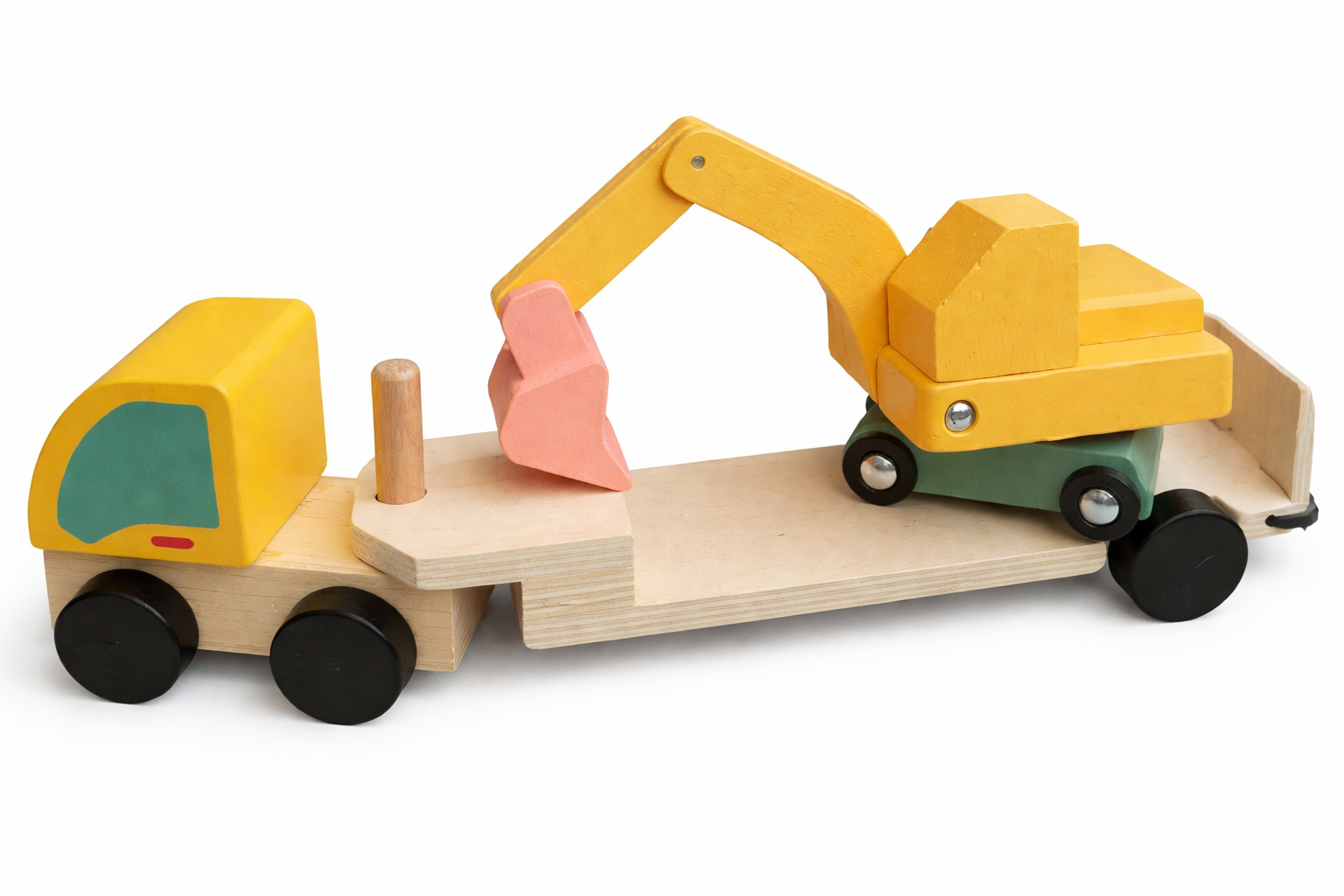 Este juguete móvil de madera combina un camión con tráiler desmontable y una excavadora con ruedas, permitiendo a niñas y niños crear infinitas historias de construcción mientras juegan. El camión cuenta con ruedas funcionales que facilitan su desplazamiento y, además, el tráiler se puede desarmar, quedando solo la cabeza del camión para nuevas formas de juego.
