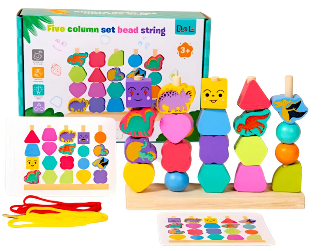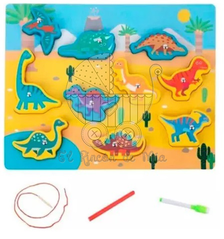 • Enhebrar: Todos los dinosaurios traen un agujero para poder enhebrarlos y seguir trabajando la motricidad fina.