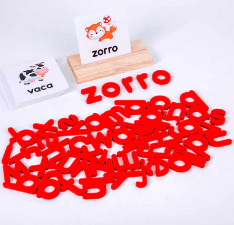 el set incluye: Letras de madera, fichas con imágenes y palabras, tabla para parar las fichas.