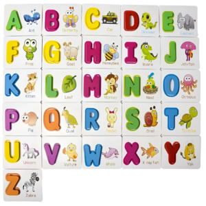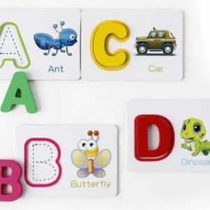 Las tarjetas presentan mayúsculas y minúsculas, ilustraciones y palabras en inglés, favoreciendo el reconocimiento de letras, la asociación visual y un primer acercamiento al idioma de manera natural. Al encajar las letras y practicar la escritura, niñas y niños desarrollan la motricidad fina, la coordinación mano-ojo, la concentración y la familiarización con la lectoescritura.