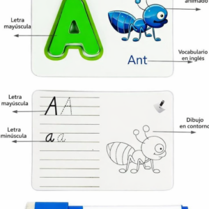 Este juego didáctico es ideal para acompañar el aprendizaje del abecedario completo de forma lúdica y significativa. Incluye letras de madera encajables, tarjetas educativas donde cada letra puede colocarse y encajarse correctamente, y un plumón borrable para practicar el trazo una y otra vez.