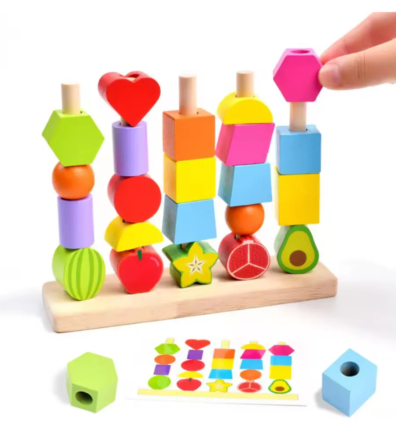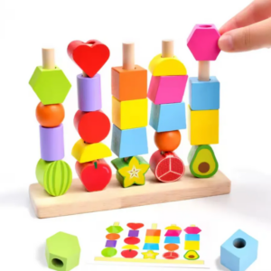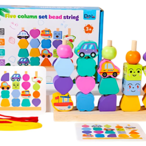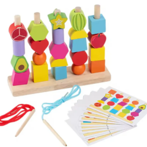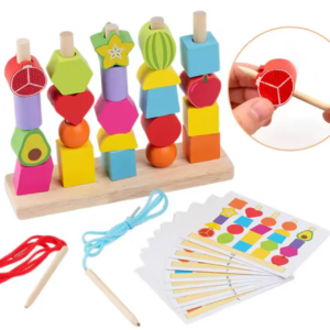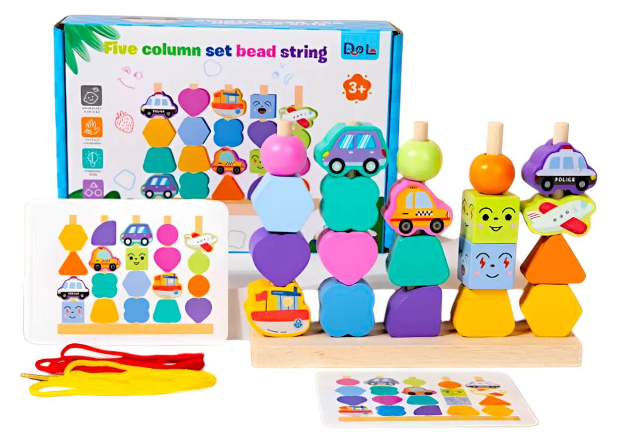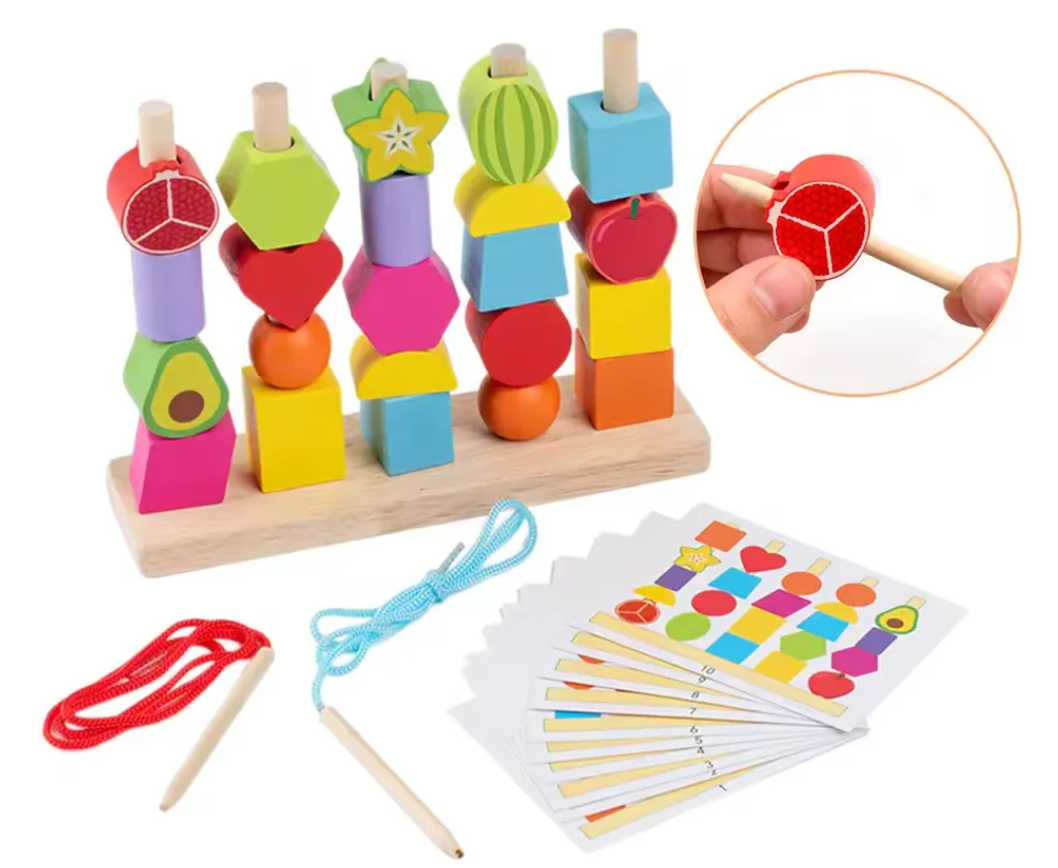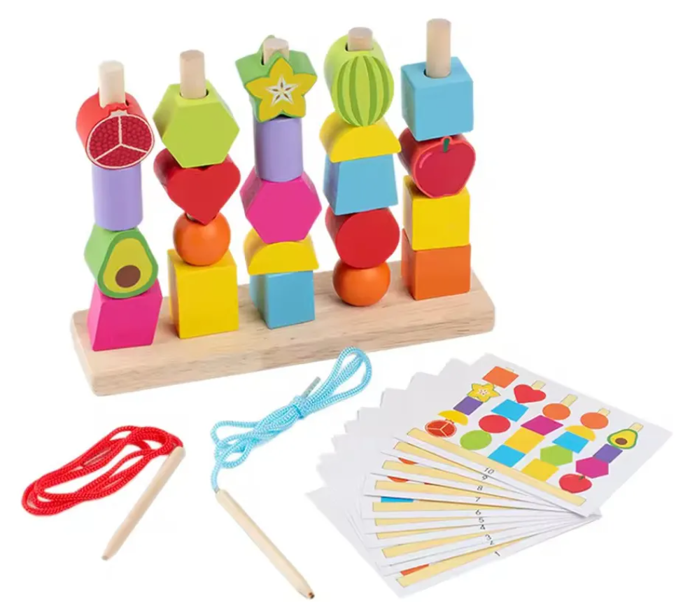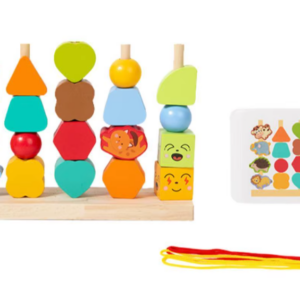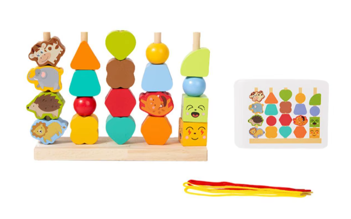 Este juego didáctico de madera invita a niñas y niños a recrear patrones, encajar piezas y apilar formas de manera entretenida y desafiante. Incluye piezas de diferentes colores y formas, base de madera con postes, cordones y tarjetas con modelos, que guían a los niños a reproducir secuencias y combinaciones.