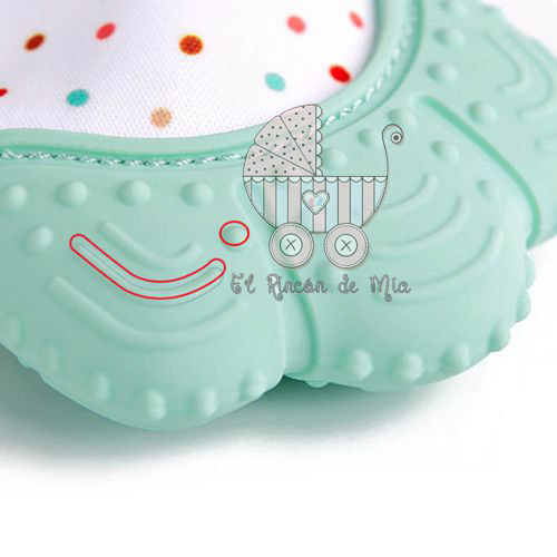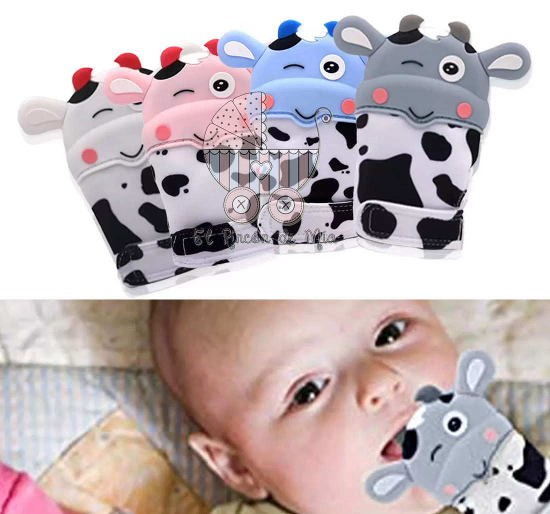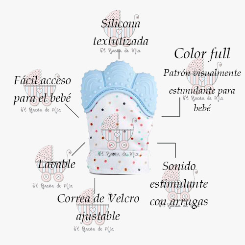 Mitón guante mordedor con diseño para bebés recién nacidos ideal para cuando aun no pueden tomar nada debido a que se sujetan a sus muñecas con velcro debiendo solo llevar a su boca sus manitos ayudando a aliviar la picazón de encías gracias a su textura de silicona, sus colores llamativos ayudan a que se interesen en el producto y quieran explorarlo por lo que se lo llevan a la boca.