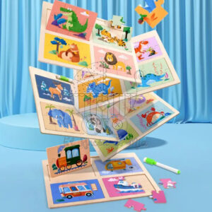 Este juego cuenta con 4 rompecabezas de madera y al otro lado cuenta con una pizarra para dejar volar la imaginación.